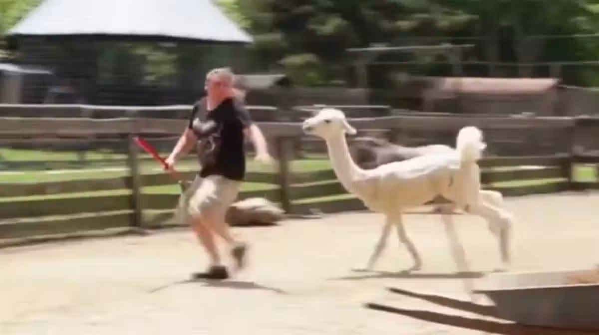 他邊躲開羊駝邊逃跑,跑到無路可走了,小哥急中生智找到了生機,只見小哥一躍翻過圍欄便揚長而去,整個畫面看起來非常滑稽。