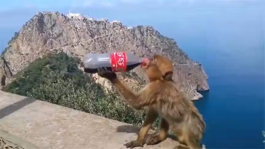 猴子從遊客手中「搶來可樂」,在懸崖邊沒喝幾口,就樂極生悲了