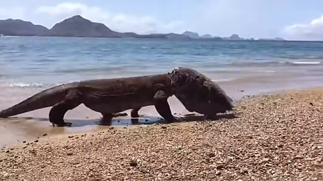 帶著「頭盔」的怪龍一步步走上沙灘:科莫多龍為吃光龜肉鑽進龜殼,合體成「科莫多龍龜」