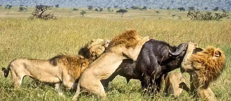 當然,也有其他方面的原因,比如非洲野牛被獅群圍攻時,會處於恐慌狀態,這個時候它們被嚇得膽戰心驚,腿腳無力。不過,無論什麼原因,野牛深知哪怕不能立即逃跑也不能倒下來,如果倒下來隻會涼得更快,所以只好站在那裡任由獅子啃。 在這個過程中,進退兩難的野牛其實也一直在等待逃跑的機會,而不是因為它們太傻。野牛當然想逃命,但是面對力量龐大的獅群時往往沒有任何辦法。
