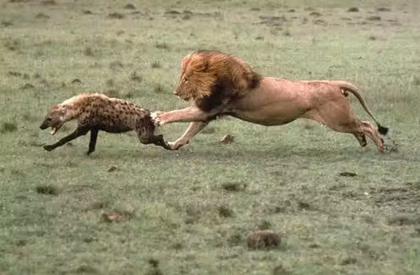 鬣狗很少和獅子對戰特別是雄獅,不到迫不得已的情況下一般都不敢輕易去惹怒雄獅,這頭不怕死的鬣狗竟然敢來搶奪獅王的食物,