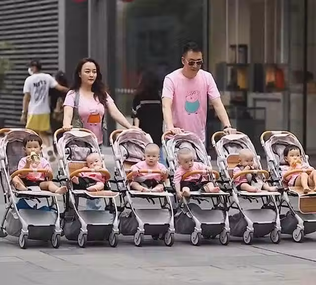 一胎雙胞胎女兒,二胎喜得四胞胎男娃,霸氣夫妻一家橫行出街「6輛嬰兒車並行」路人回頭率百分百