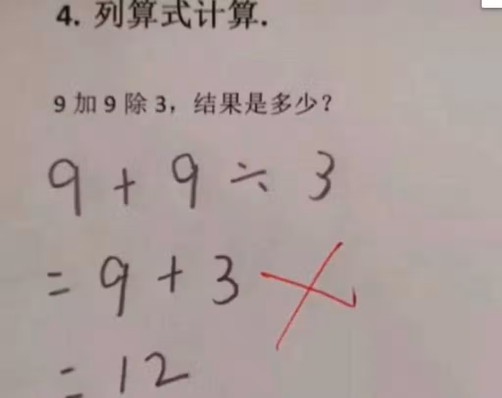除和除以是兩回事,不能混為一談,這道題的正確列式應該是9+3÷9等於9又3分之一。家長這才知道是自己的問題,趕緊給老師道了歉。