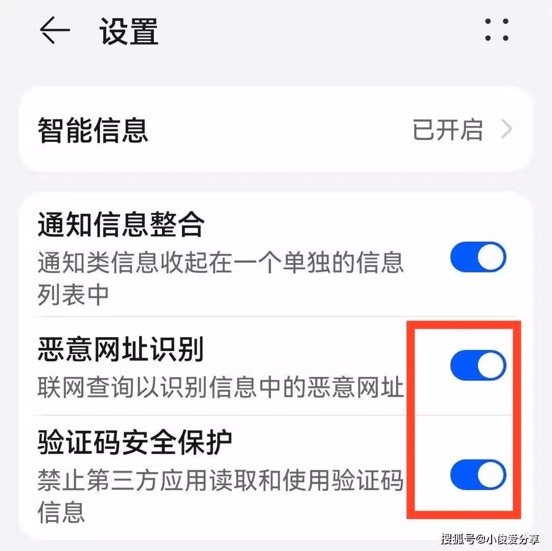 手機就可以自動識別簡訊息中帶有惡意連接的短網址,並且進行攔截,防止我們點擊這個短連接跳轉到其它頁面,造成賬號信息被盜的情況,從而保護手機財產資金安全,打開這個開關之後呢,我們再接著往下看,在下面呢有一個驗證碼安全防護的開關,此時呢我們也要手動把它打開,默認狀態下呢,也是關閉的,開啟驗證碼安全防護開關之後,手機就會禁止一些第三方應用讀取和使用我們的驗證碼,從而呢就可以避免我們的的賬號密碼泄露,以及個人信息泄露,同樣可以起到保護我們財產安全的作用!
