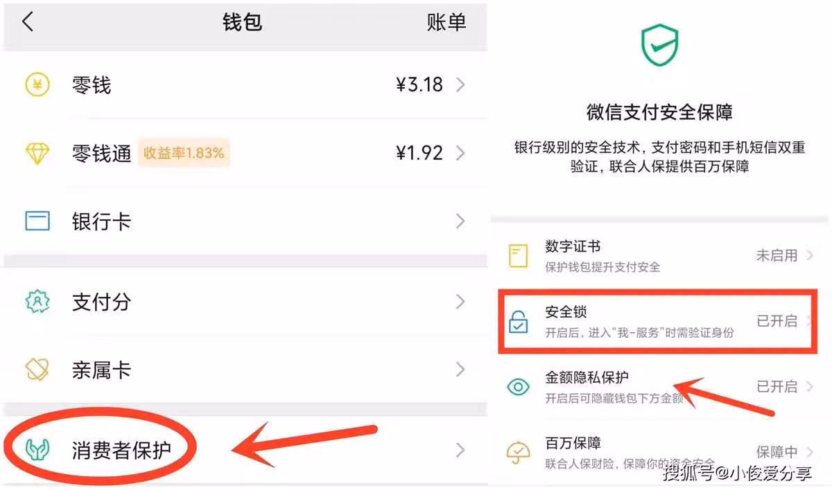 我們點擊微信服務打開,然後找到錢包,在錢包頁面點擊消費者保護,點擊打開消費者保護之後,在這邊就有一個安全鎖功能了,默認是關掉的,我們需要手動給它打開,打開之後,就能保護我們的資金安全了!