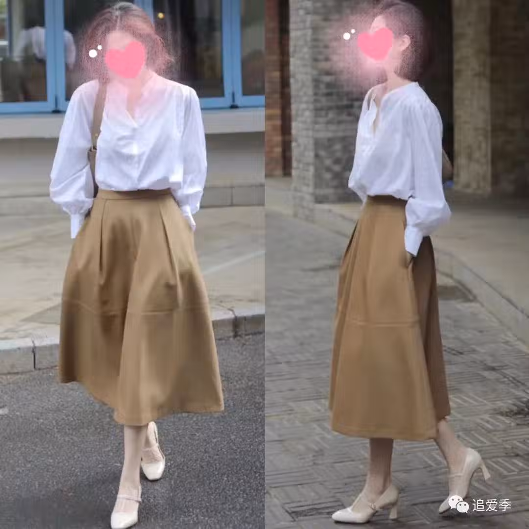 傘裙與襯衫結合,把女人的溫婉恬靜很輕鬆的就呈現,同時也減輕了襯衫的那一股生硬的感覺,美中帶著帥氣感。搭配一雙中跟鞋,更是顯得端莊有氣質,是很有氣場。
