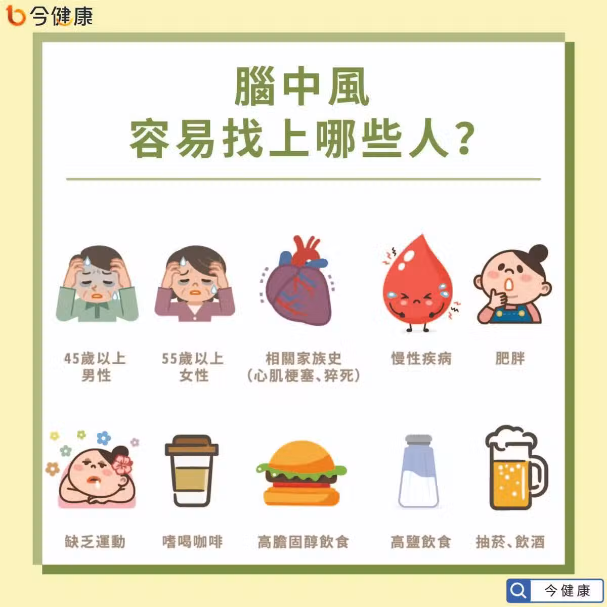 還有一種「小中風」,癥狀會持續幾分鐘或幾十分鐘,最多不超過 24小時,不會留下任何後遺癥,多數患者患病的時候意識清楚。