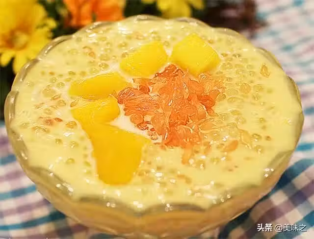 7、放入準備好的水果粒就完成了美味的楊枝甘露啦。