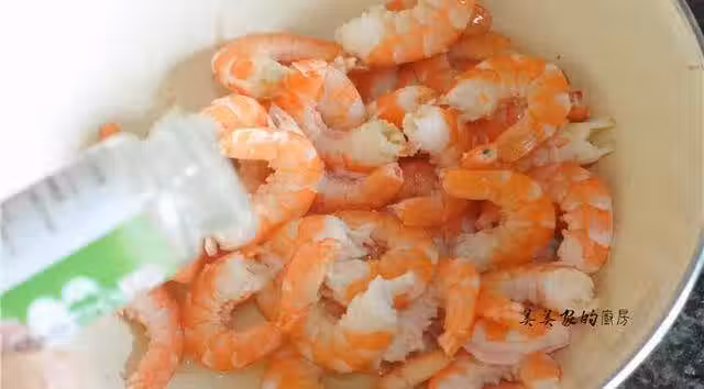 蝦仁稍微放涼至不燙手後,去殼,從背部切開,去掉蝦線。(新鮮的蝦也是一樣的做法,去殼、開背、去蝦線直接腌制即可)蝦肉洗乾淨料酒,胡椒粉腌幾分鐘。