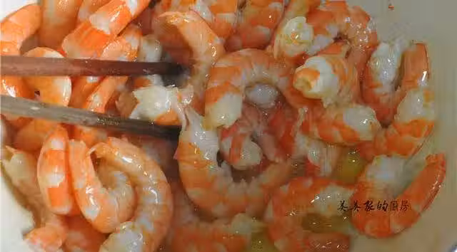 腌好的蝦仁把多餘的湯汁倒掉,雞蛋打散,少放點鹽,讓每一個蝦仁都均勻的掛上蛋液。