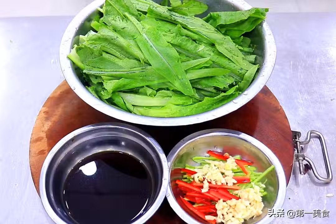 2.鍋內燒水,水燒開以後放入油麥菜,淋入一點植物油、這樣油麥菜會顯得油潤發亮,大約焯水30秒鐘,油麥菜燙軟、返青以後倒出來。
