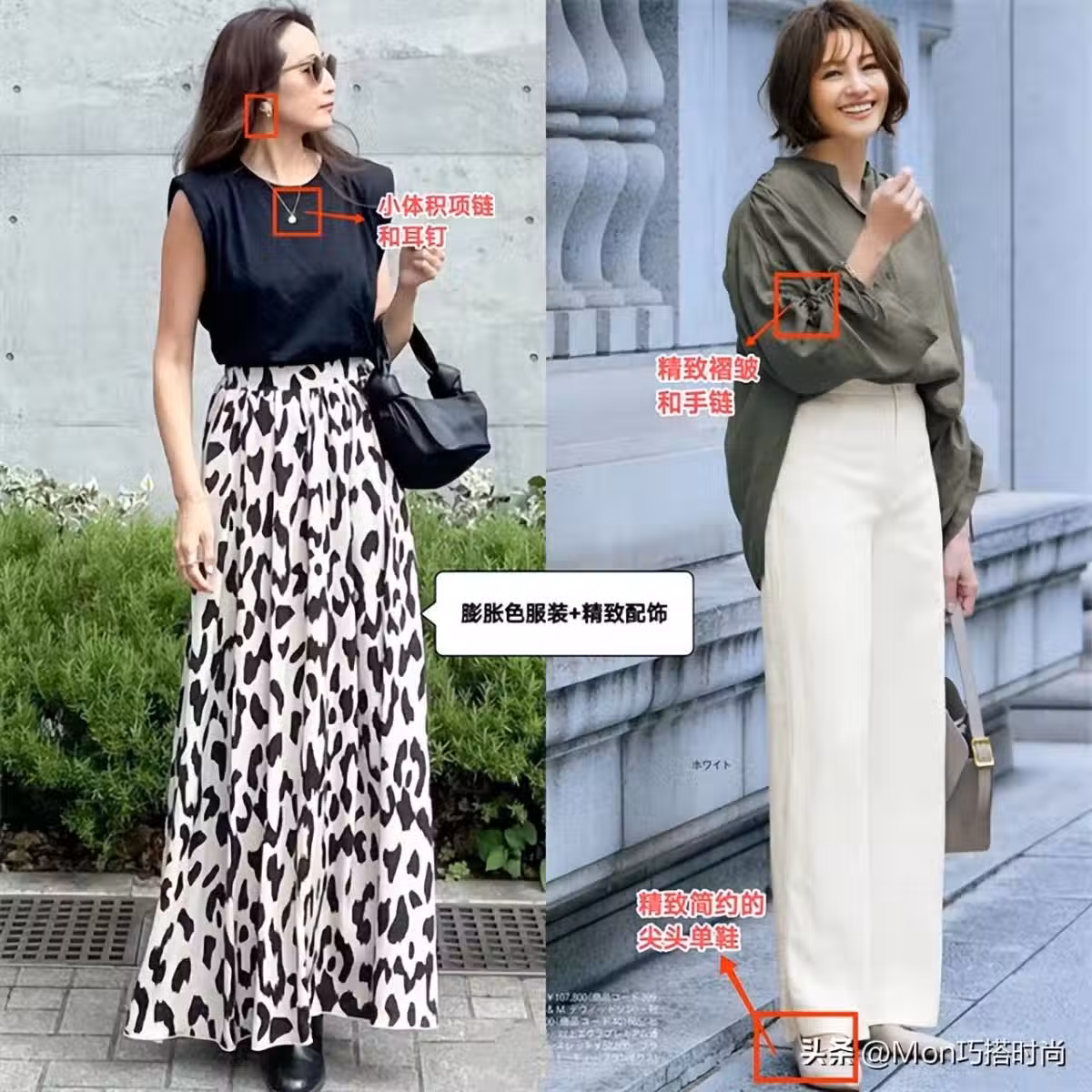 答案是多穿小量感淺色底花色單品、淺色等膨脹色讓身形更豐滿,再用成套耳釘、項鏈、簡約尖頭鞋等小而精緻的飾品豐富搭配。