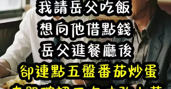 我請岳父吃飯,想向他借點錢,岳父進餐廳「卻連點五盤番茄炒蛋」老闆確認三次才敢上菜!我感到不對勁,結帳時卻瞬間驚呆…