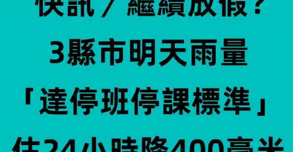 快訊/繼續放假?3縣市明天雨量「達停班停課標準」 估24小時降400毫米