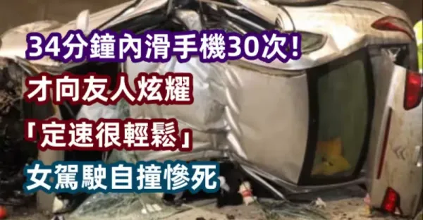 34分鐘內滑手機30次!才向友人炫耀「定速很輕鬆」 女駕駛自撞慘死