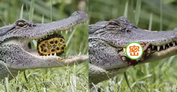鱷魚深淵巨口含住烏龜,幼小烏龜無力反抗,下秒鱷口緊閉龜殼盡碎龜腸流出