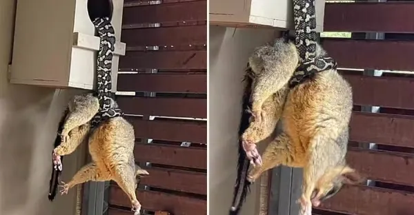 大負鼠的花腰帶?寵物負鼠倒掛巢箱,黑花色地毯蟒「致命纏繞」,是淪為巨蟒午餐還是逃出生天