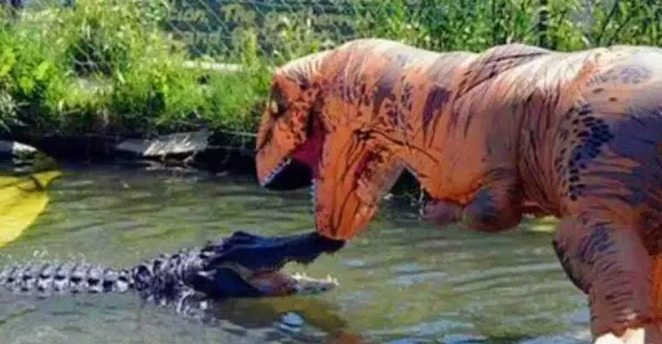 老外穿上恐龍服裝,襲擊水池中的鱷魚,「鱷魚的行為」把人看懵了