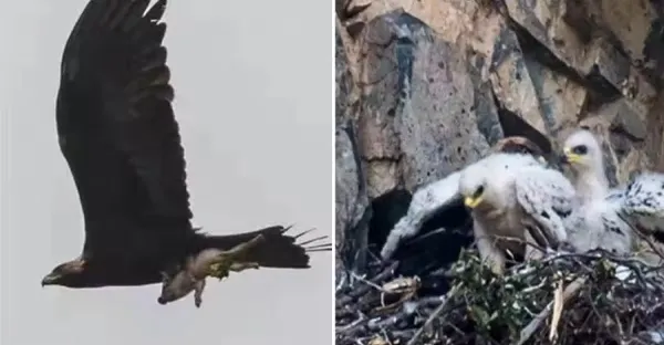 「豬真的在天上飛!」金雕高空俯衝抓走野豬幼崽,回巢後喂幼崽吃豬肉