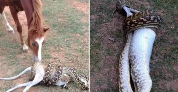 小馬看到昔日玩伴沙袋鼠被纏住,無能爲力 一旁靜靜看完全過程,巨蟒蛇口大張全部吞下