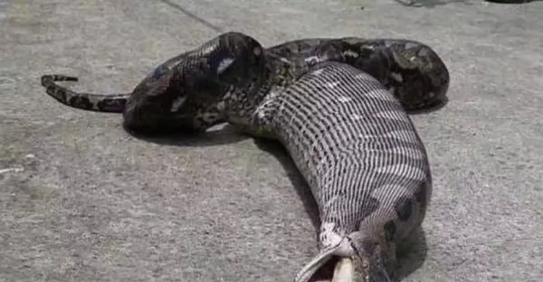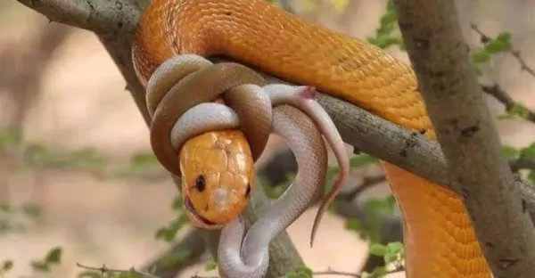 非洲屋蛇裸絞比自己大得多的黃金眼鏡蛇,結果因用力過猛導致「脫肛」