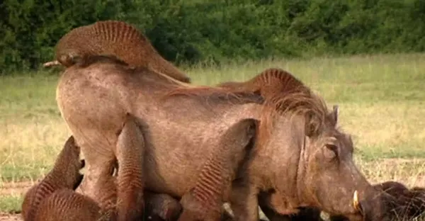 一群貓鼬圍攻疣豬,為啥疣豬不但不反抗,反而躺在地上很享受?_動物界_群體_關係