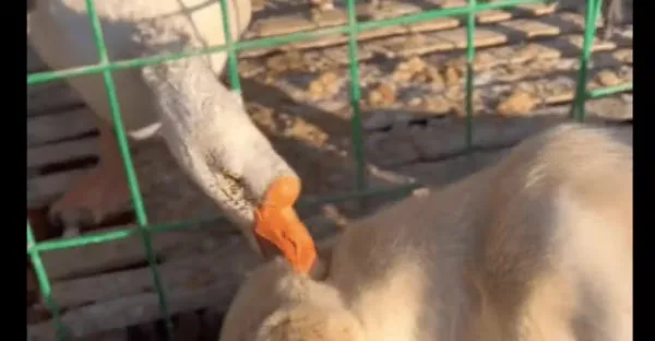 狗狗偷吃大鵝的飯,被大鵝咬了無數下也不躲,吃貨本色顯露無疑啊_網友_老家_腦袋