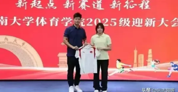 全紅嬋開學第一天有些緊張,24歲師姐陪伴一起,與院長蘇炳添合影