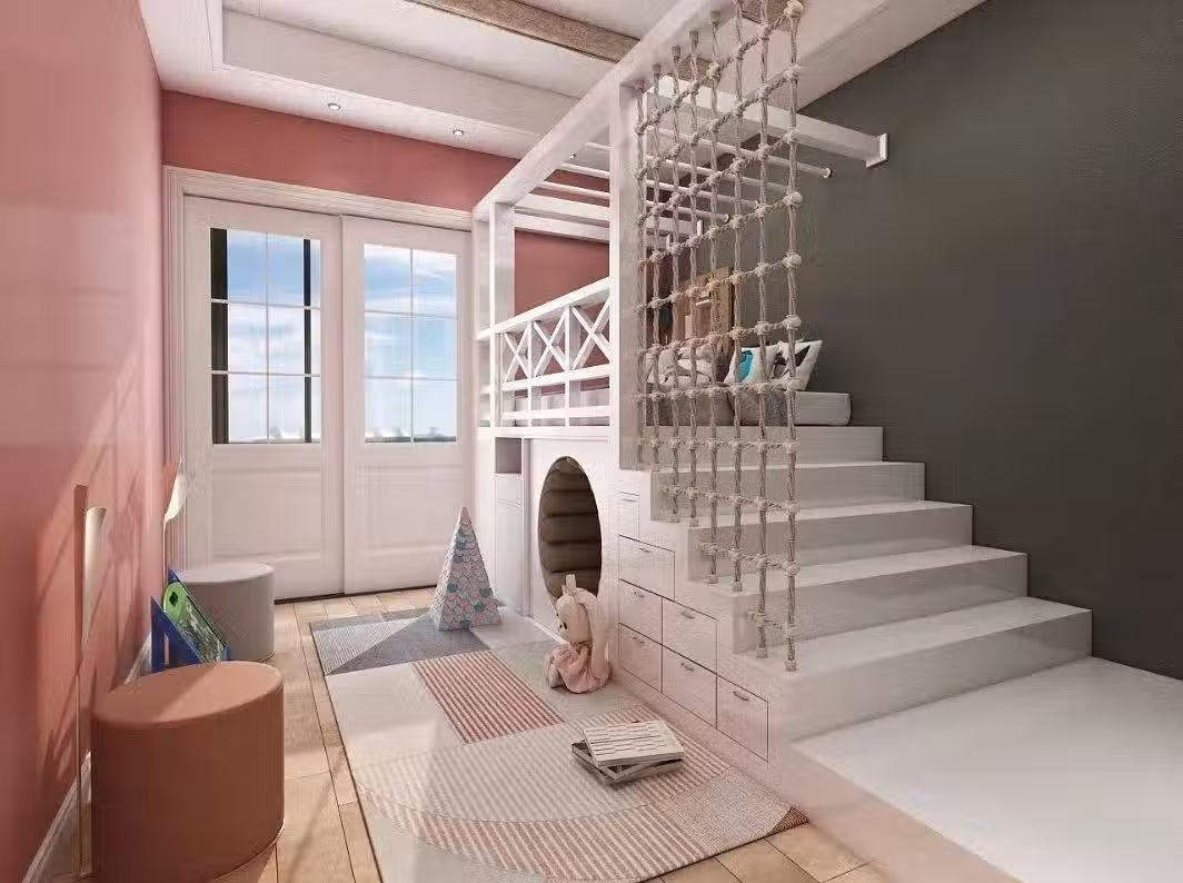同時,樓梯上巧妙地設置成抽屜樣式,大大增強了收納空間,給寶寶留出更多的游戲娛樂空間。