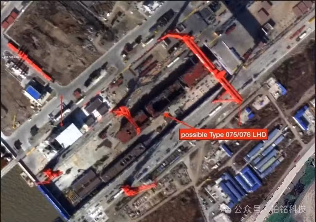 而早在1月,外國衛星就曾拍攝到076型船塢。衛星圖顯示,船塢周邊部分建築,屋頂是藍色的,同央媒等官方媒體發布的圖片,兩者大致相符,似乎坐實了這一推測。當然,這還有待官方確認。