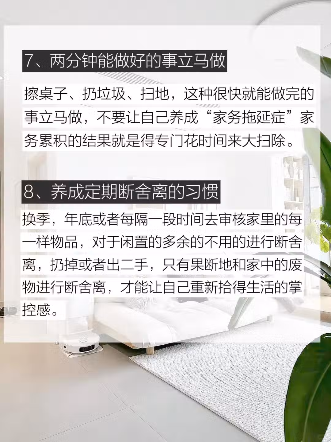 像擦桌子、扔垃圾、掃地這樣的小家務,如果能在兩分鐘內完成,就不要拖延。