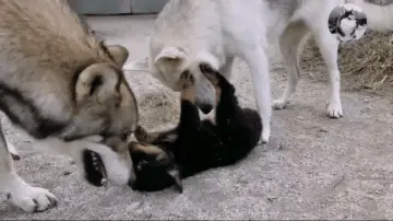 哈士奇以大欺小,跟它的夥伴一起去欺負「小黑」。