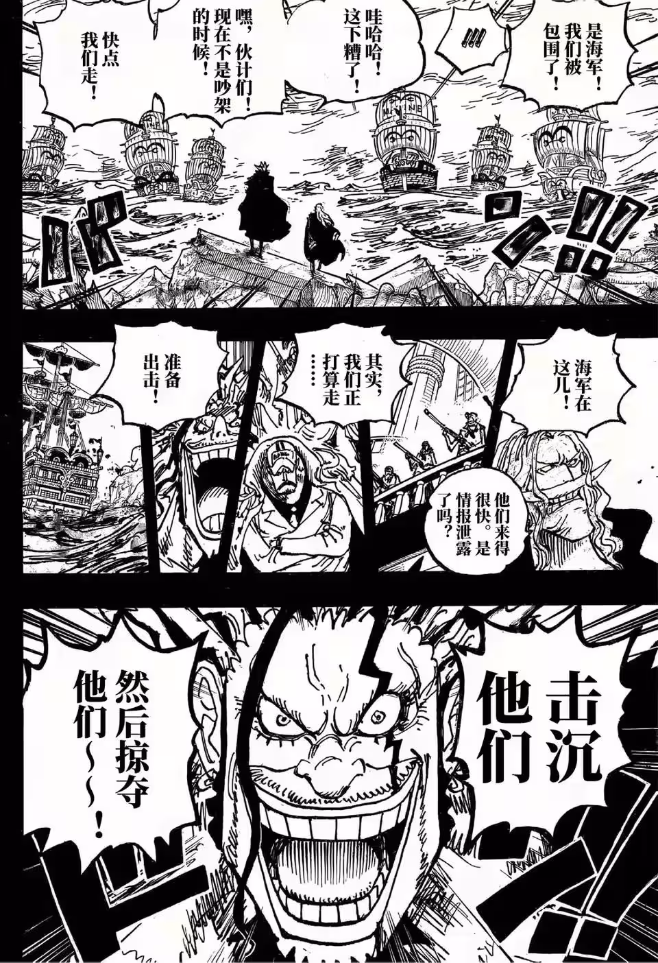 幾艘海軍軍艦出現,他們把洛克斯海賊團包圍了,白鬍子走到洛克斯身邊,他告訴洛克斯,這些海軍似乎提前知道我們在這裡,看來我們內部出現了叛徒。洛克斯完全不在乎,他開始大喊出航了,然後把海軍全部消滅,搶奪他們的糧食。洛克斯一招過去就摧毀了一艘軍艦,在新世界的艾尼希,哈拉爾德國王的船隻擋住了CP0的軍艦,他們抓住了幾個人質。