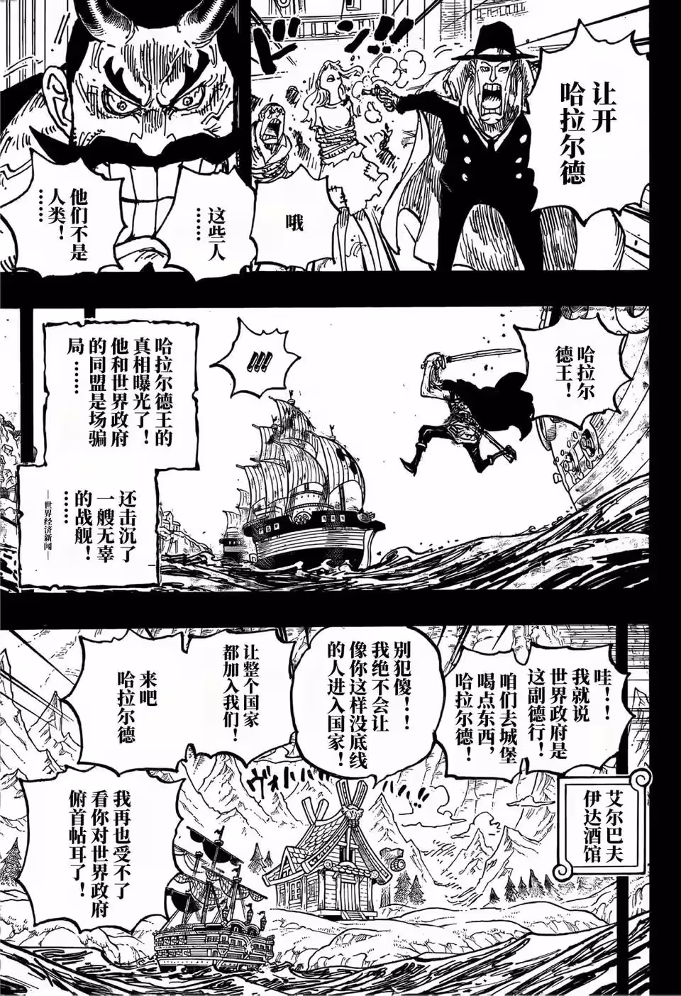 CP0使用手槍指著人質,要哈拉爾德國王馬上離開,不然就開槍了。哈拉爾德國王一劍劈過去,直接把CP0的軍艦砍掉。洛克斯來到艾爾巴夫的冥界,他正在和哈拉爾德國王喝酒聊天。哈拉爾德國王想要加盟世界政府,洛克斯卻說跟我一起當海賊吧,哈拉爾德國王拒絕了,他知道巨人可以成為海軍了。
