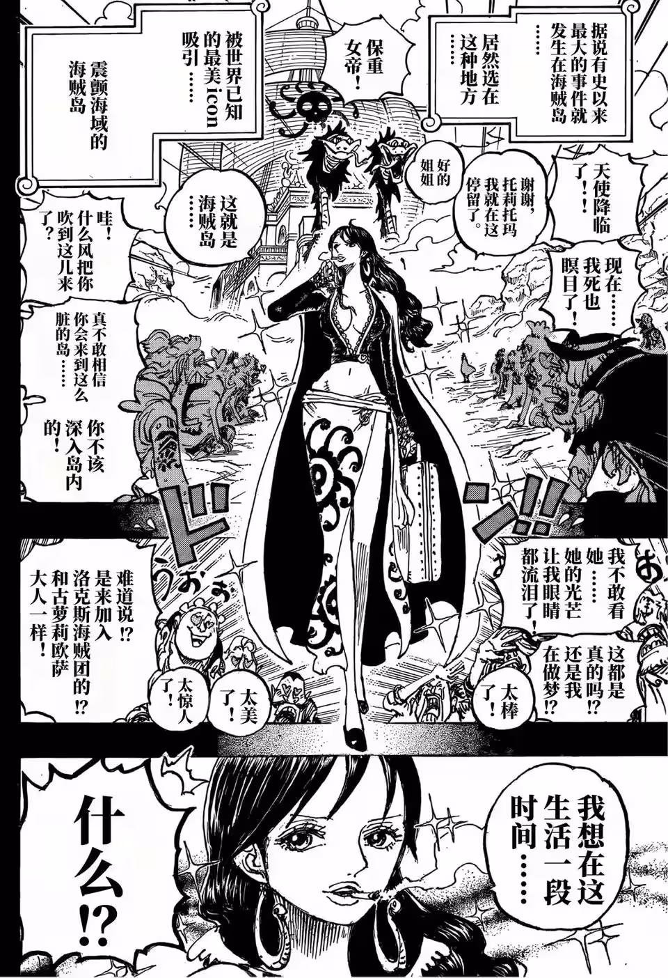 漫畫最新一話的標題是傳說的酒吧,這是指夏琪在蜂巢島開設酒館成為傳說的存在。扉頁小故事是小菊,大和等人拜祭跟凱多交戰而戰死的前輩,後面有凱多的雪人,這是烏爾緹堆積的雪人。