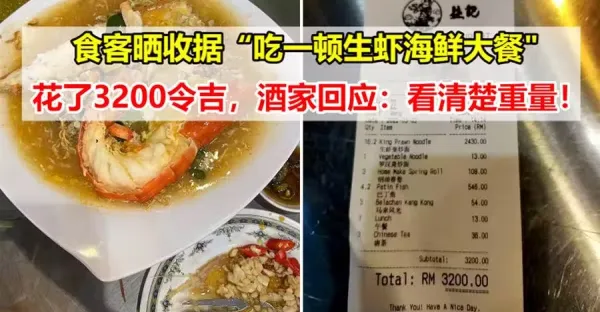 食客曬收據「吃一頓生蝦海鮮大餐需要花費3200令吉」,酒家回應:看清楚重量~