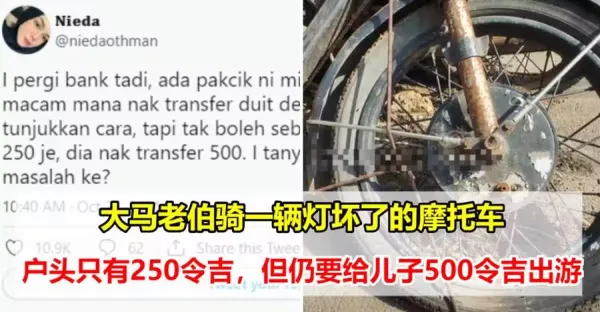 大馬老伯騎一輛燈壞了的摩托車,戶頭只有250令吉,但仍要給兒子500令吉出遊